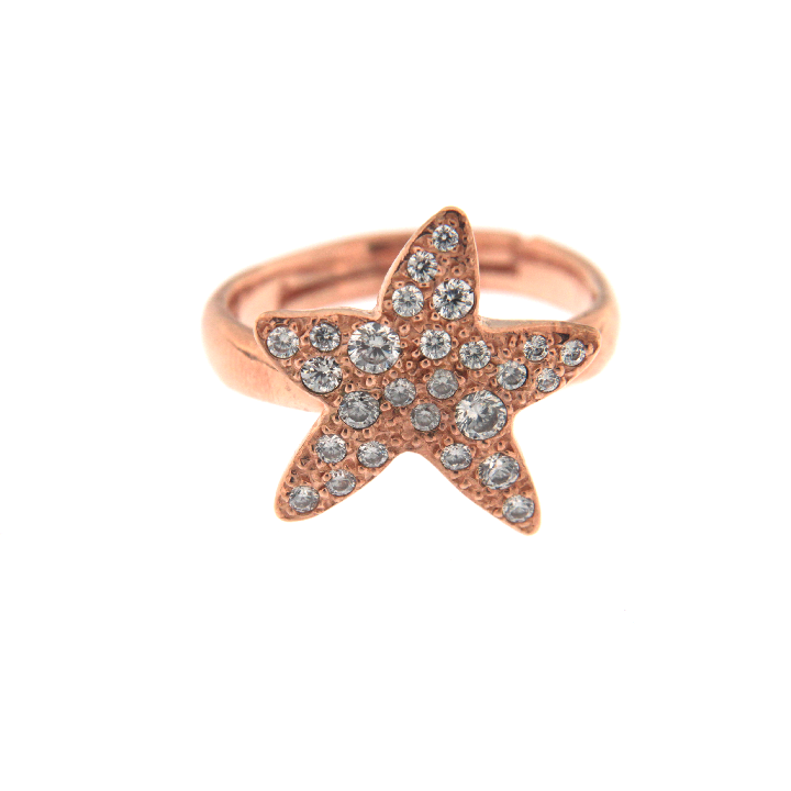 Anello pavè in argento 925 a forma di stella marina con uno studio particolare di incassatura mista, arricchito da pietre taglio brillante di colore argento o argento rosè.