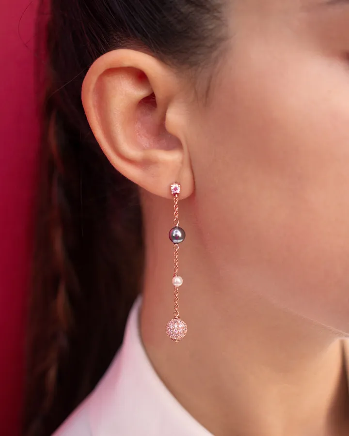 Orecchino perle alternate bianche e grigie con boulle zirconi bianchi in ag925 rosè