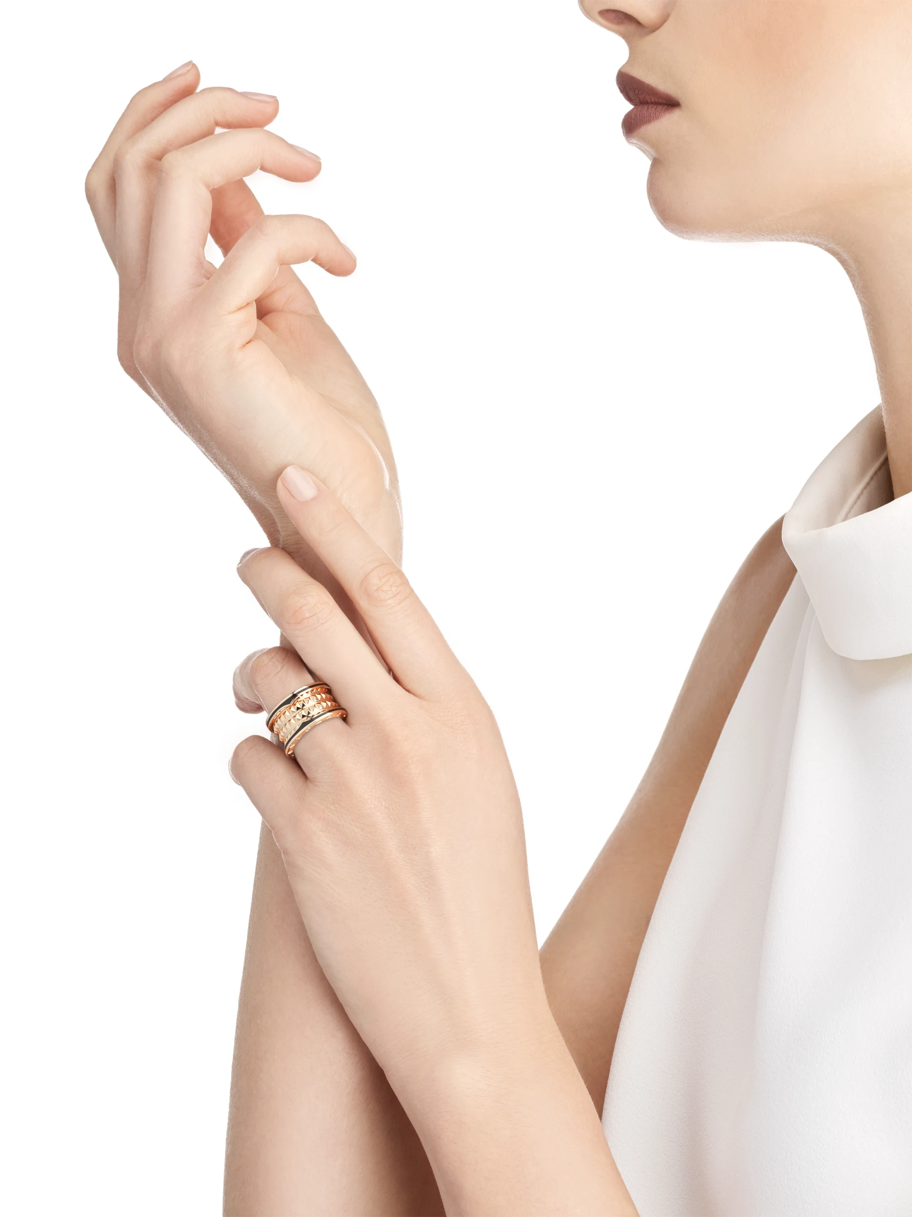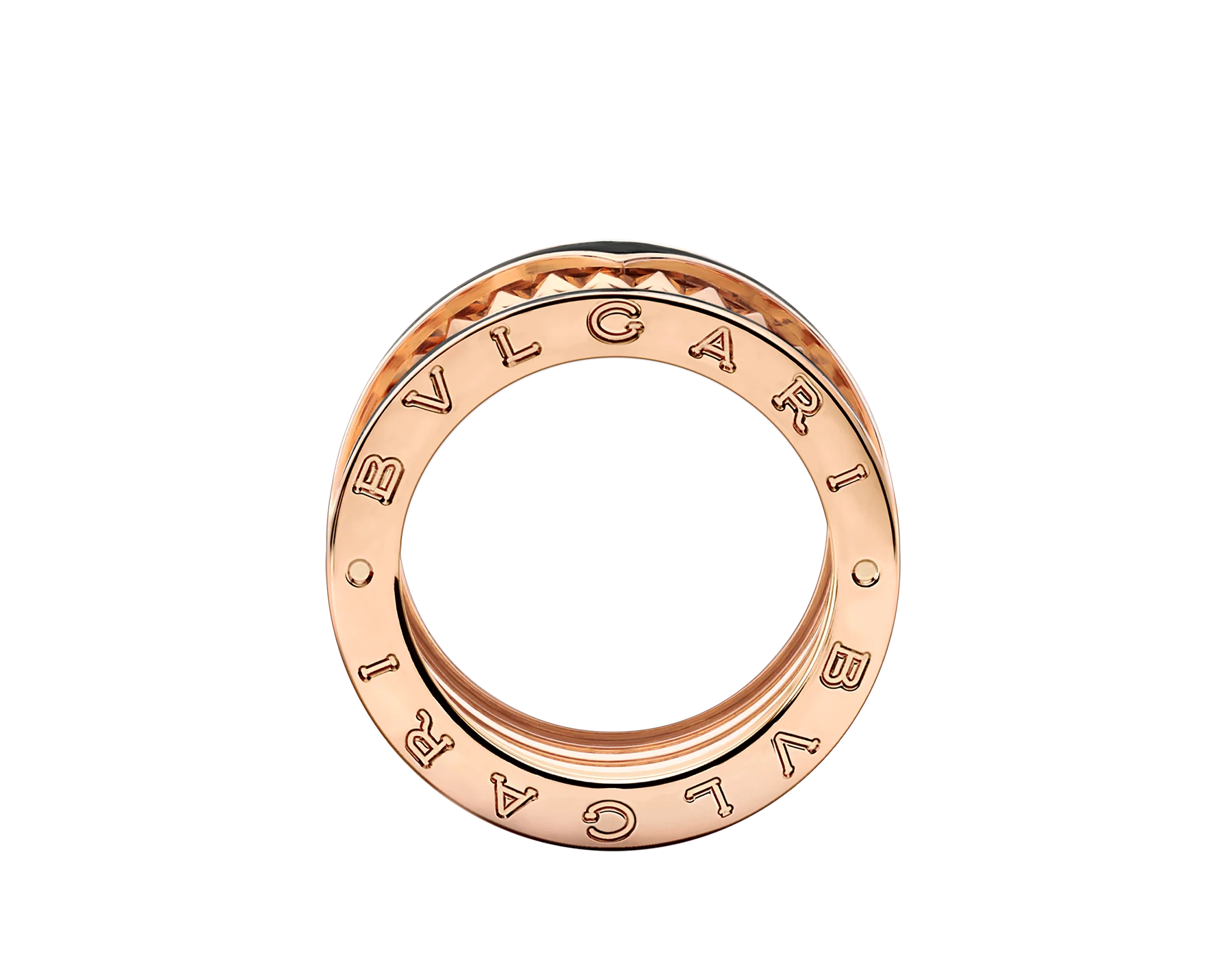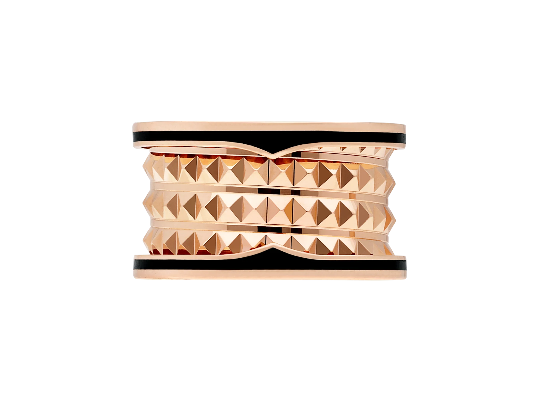Ispirato all’anfiteatro più famoso al mondo, il Colosseo, B.zero1 Rock è una suprema attestazione del talento creativo di Bvlgari e dello spirito irriverente che anima le creazioni della Maison. Rivoluzionando i canoni della gioielleria tradizionale, Bvlgari rinnova il fascino dell’iconica spirale rivestendola di preziose borchie d’oro. Un emblema dello stile audace e visionario del design B.zero1. Anello a quattro fasce B.zero1 Rock in oro rosa 18 kt con inserti in ceramica nera.