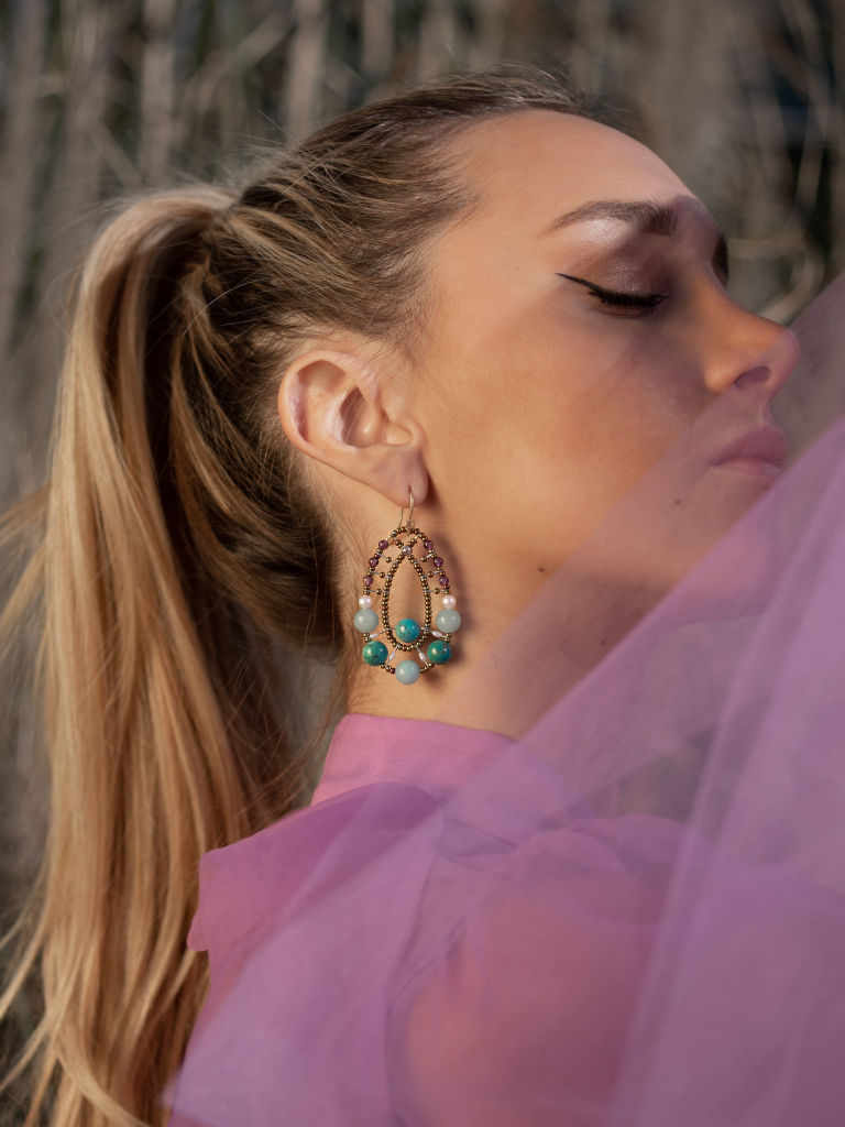 Composizione: Amazonite, Ametista, Perle di vetro di Murano, Turchese, Perle d'acqua, Argento 925.